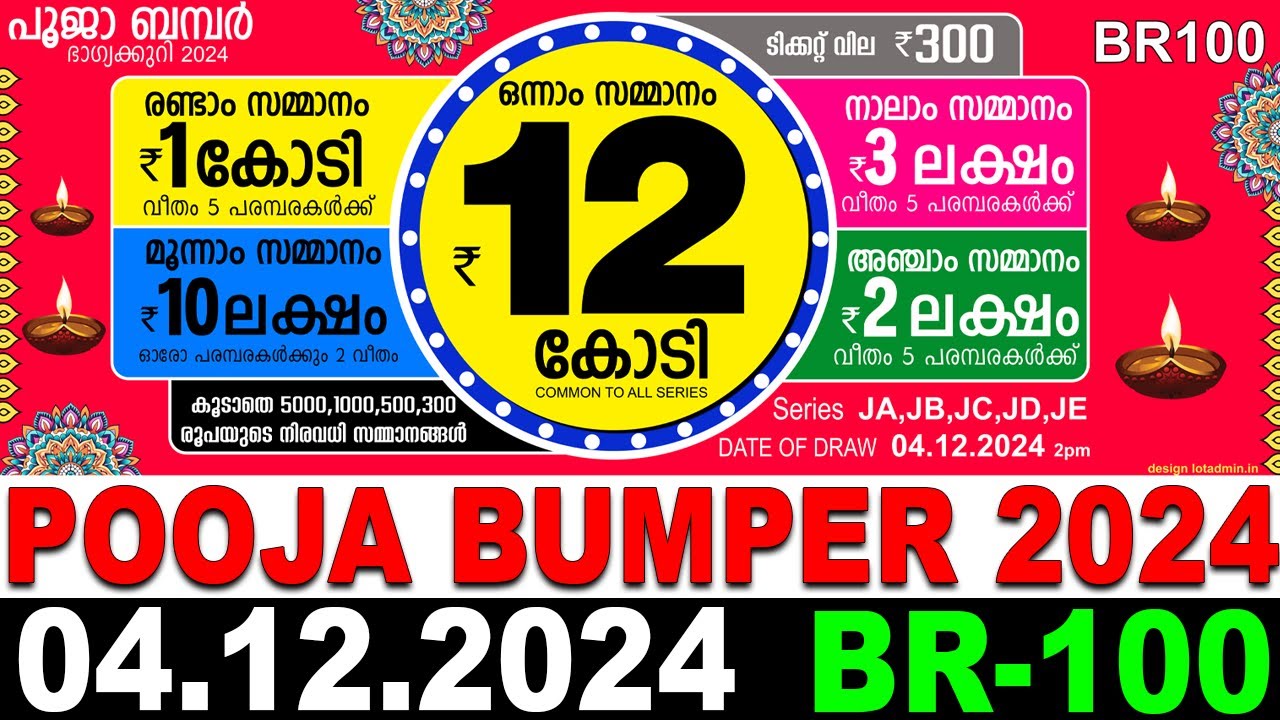 Kerala lottery is one of the most trusted government lottery systems in India, launched in 1967. It provides a source of income for thousands while funding various social welfare schemes. Users can check today lottery result, previous results, and detailed prize structure online. This page provides fast and accurate updates for Pooja Bumper BR-100 result for December 04, 2024. Always cross-check with the official gazette for final verification.